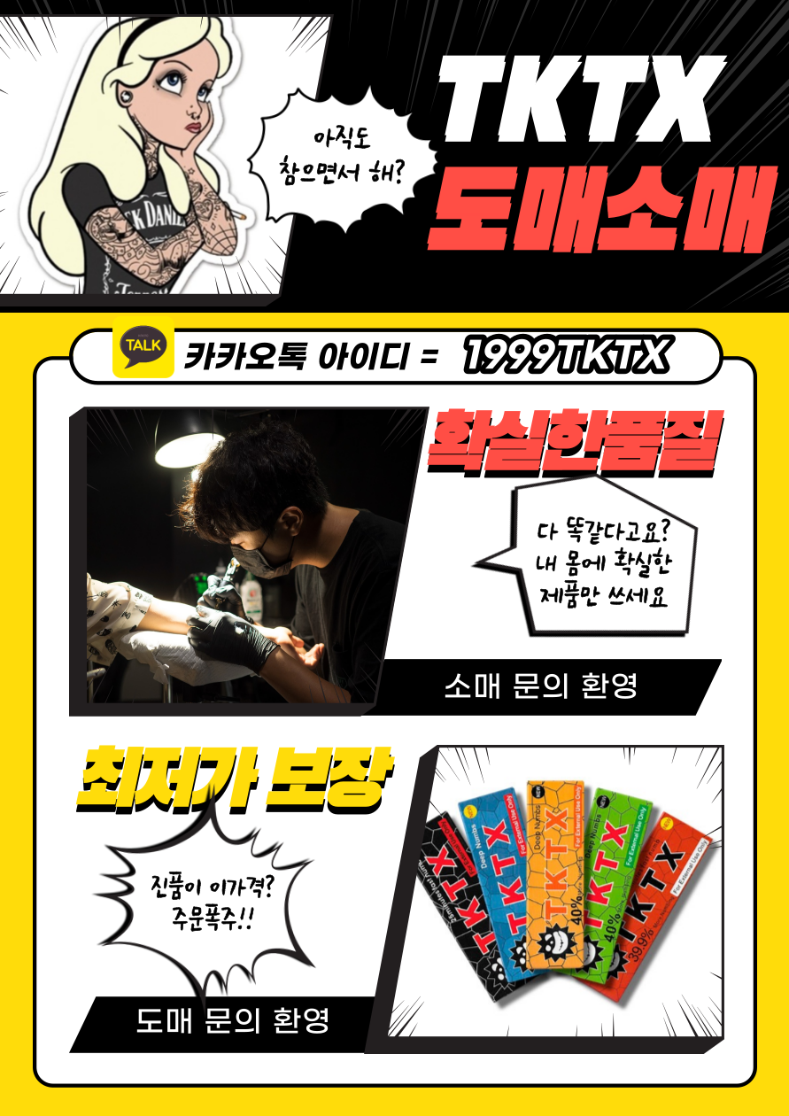 타투는 하고 싶은데, 아플까봐 고민된다면?해답은 간단합니다.TKTX 마취크림, 제대로만 쓰면 통증을 절반 이하로 줄일 수 있습니다. 하지만 문제는 “제대로 쓰는 사람이 거의 없다”는 점이죠.사용법만 정확히 지켜도 무통 시술이 가능합니다.지금부터 핵심만 직설적으로 정리합니다.정품 TKTX 문의는 항상카톡 아이디 : 1999TKTX이곳으로 해주세요 * 현재 국내에 정품 TKTX들어오는 것이 바늘구멍입니다6년간 이 장사 하면서한번도 하자나온적 없습니다믿을 수 있는 곳에서 구매하세요✅ TKTX 기본 정보 – 이것부터 알아야 한다TKTX는 올라운드 마취제입니다.→ 따로 태그45(2차 마취제) 쓸 필요 없음. 국내 유통품 대부분이 가짜입니다.→ 정품 찾는 게 제일 어려움. 직구 추천. 효과는 환경과 피부에 따라 다..